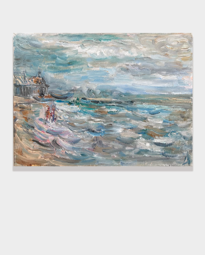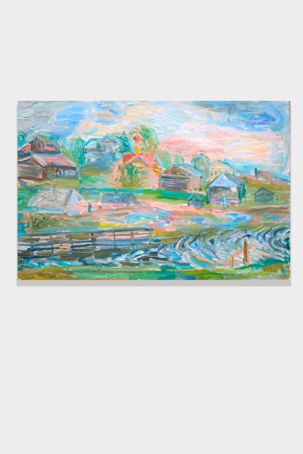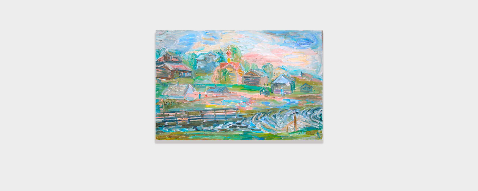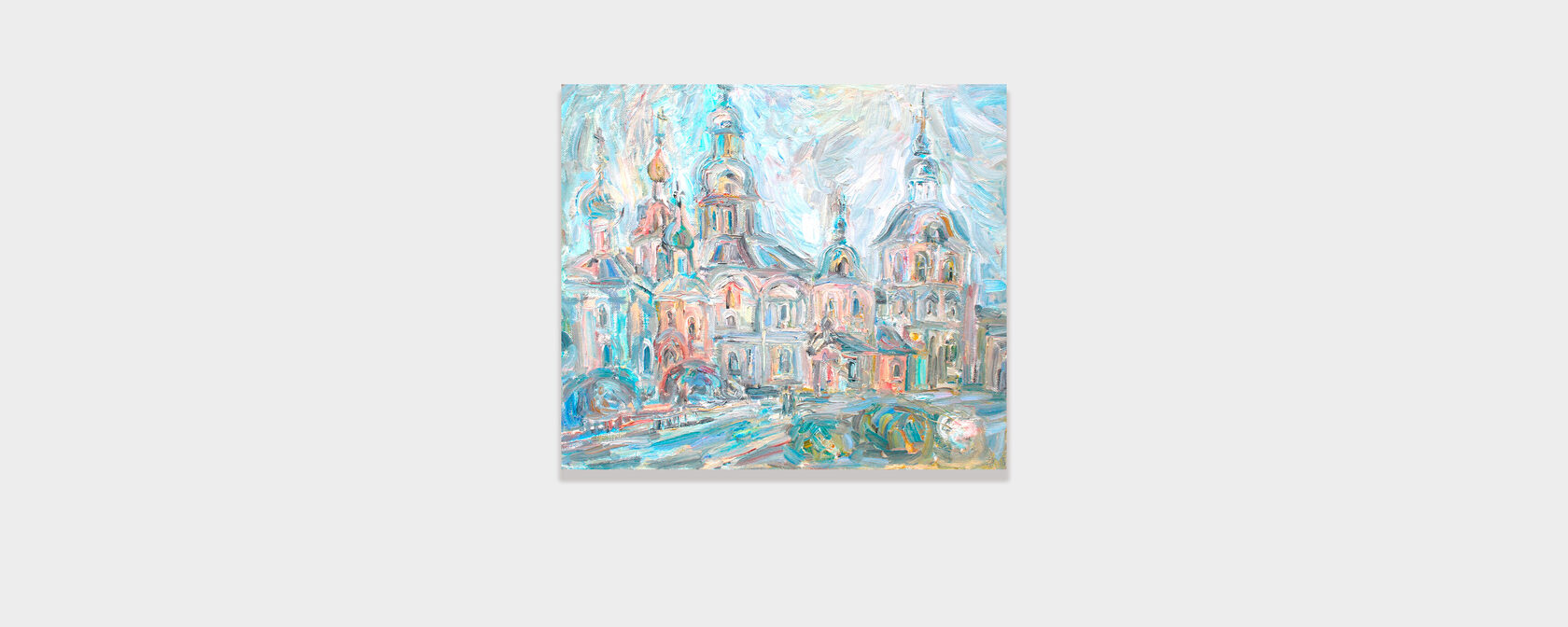 Forms are built through soft, flowing layers of color. Light emerges from within the canvas itself. Light tonalities of blue, green, and ochre define a palette in which softness is balanced by depth.